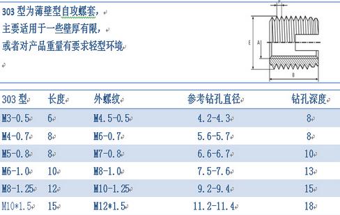 薄壁型常州自攻螺套外观上看主要有两种区分,一种是一端开槽型的,另一种是一端三圆孔型的,其中开圆孔型的又分为307型和308型两种,307型和308型外观主要区别就是同一直径下,长度和外径大小有所区分。以上各种型式螺套均具有自行攻牙功能。